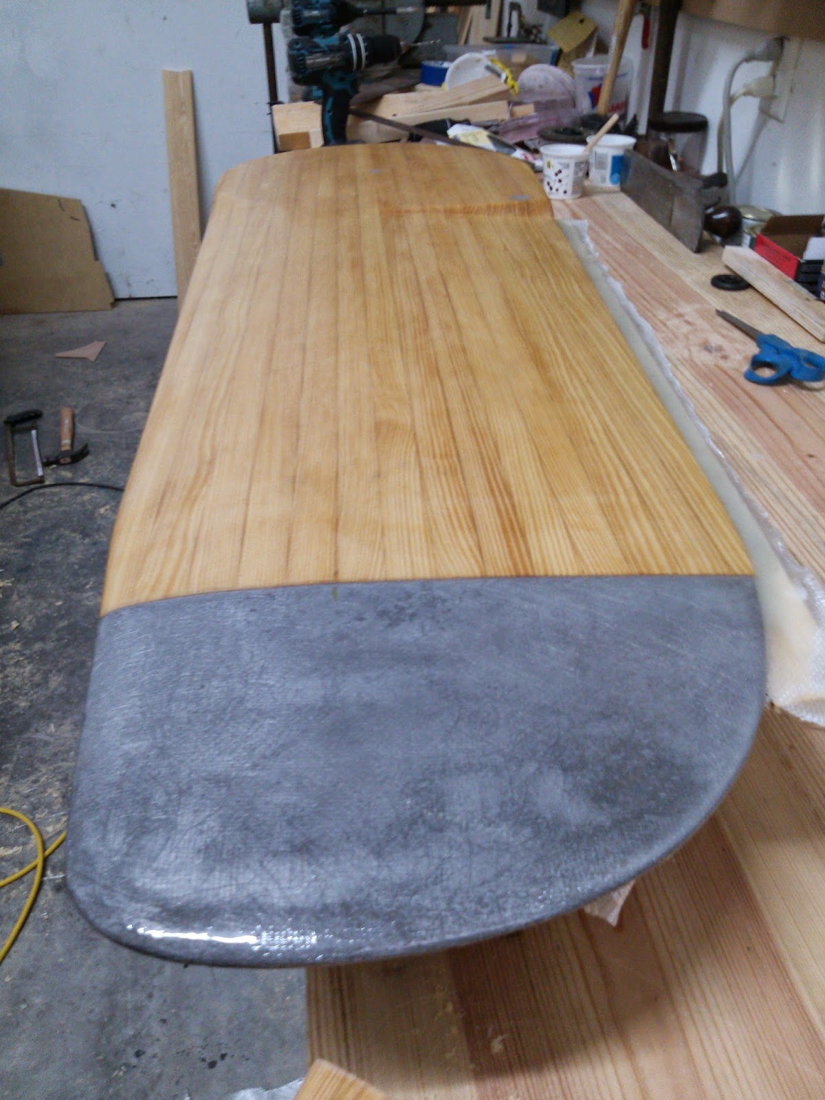 Once the lead tip was glued on, the CB was moved to the work table and the first side was glassed right away with 10oz fiberglass cloth.