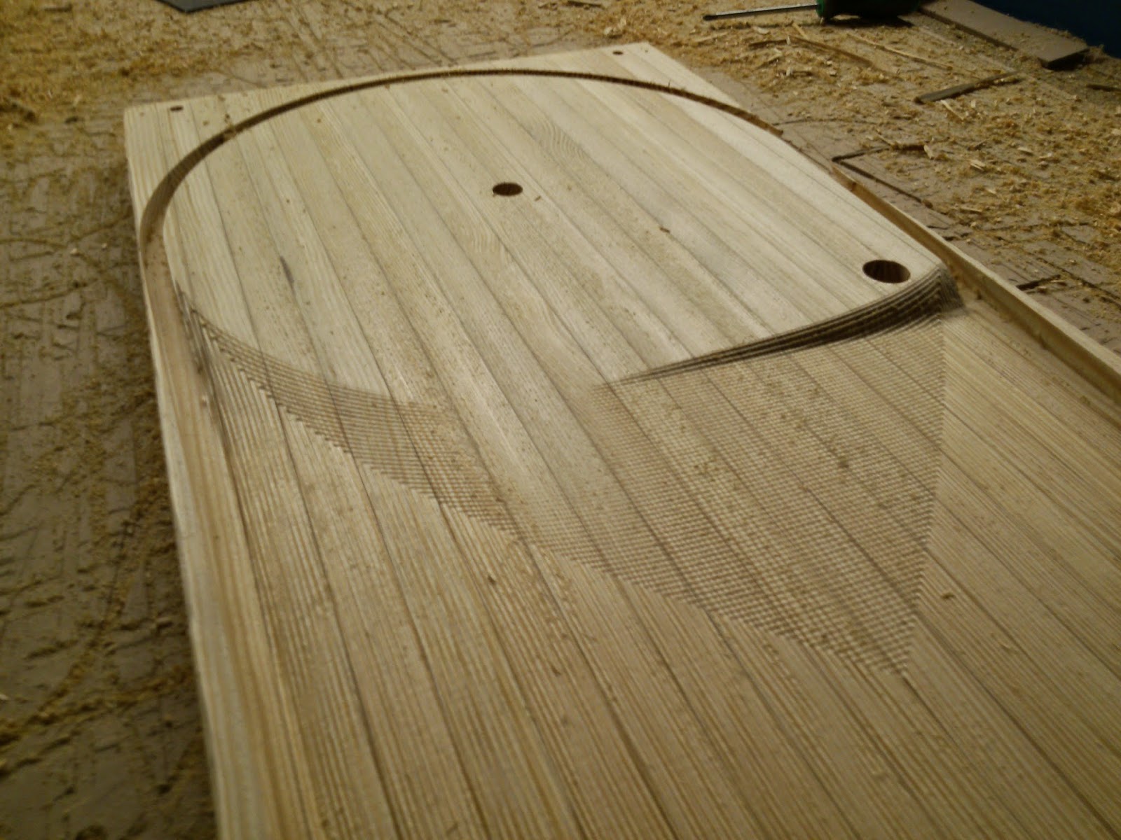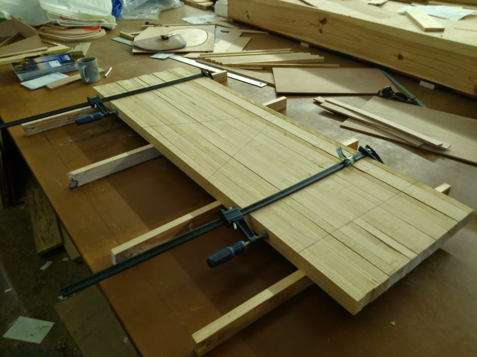 The blank is glued up from laminated quarter-sawn pine about 1" larger than the board on all sides. A large flat table really helps for this part. Double and triple check that the strips end up as flat as possible with no twist.