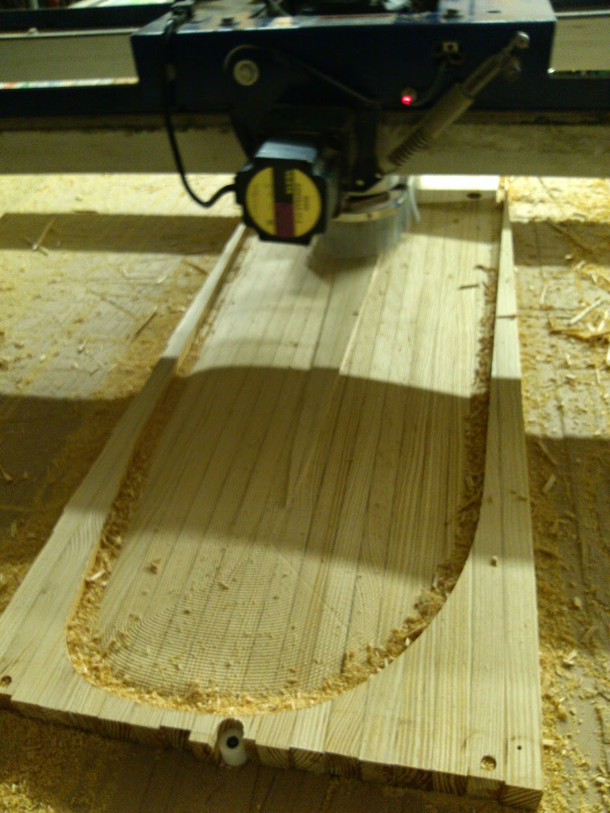 Shown here are the final seconds of machining the finished surface with a 1/4" ballnose bit. The resulting surface has small ridges that are easily sanded smooth. The machine could make the surface perfectly smooth with no sanding needed but that could take it all night! A little sanding was faster in this case.